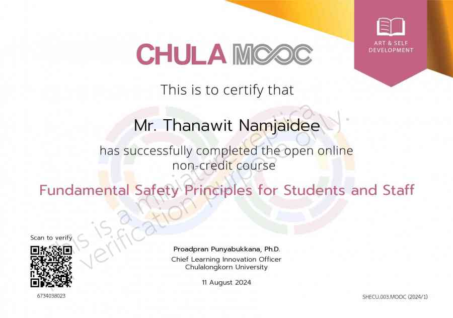 Certificate from Fundamental Safety Principles for Students and Staff for Thanawit Namjaidee