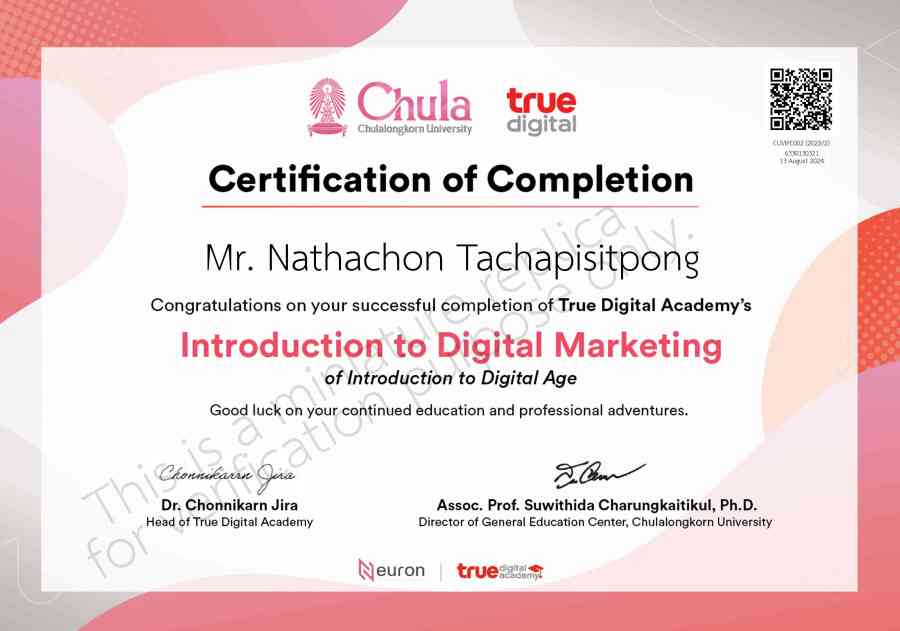 Certificate from Introduction to Digital Marketing for Nathachon Tachapisitpong