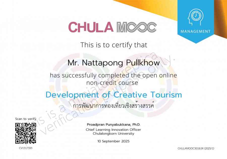 Certificate from การพัฒนาการท่องเที่ยวเชิงสร้างสรรค์ รุ่นที่ 4 for Nattapong Pullkhow