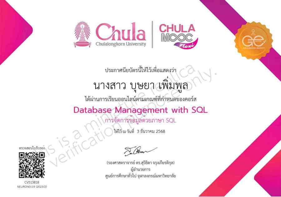 Certificate from การจัดการข้อมูลด้วยภาษา SQL for Budsaya Permpool