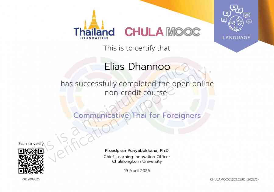 Certificate from Communicative Thai for Foreigners (จุฬาฯ) for Elias Dhannoo